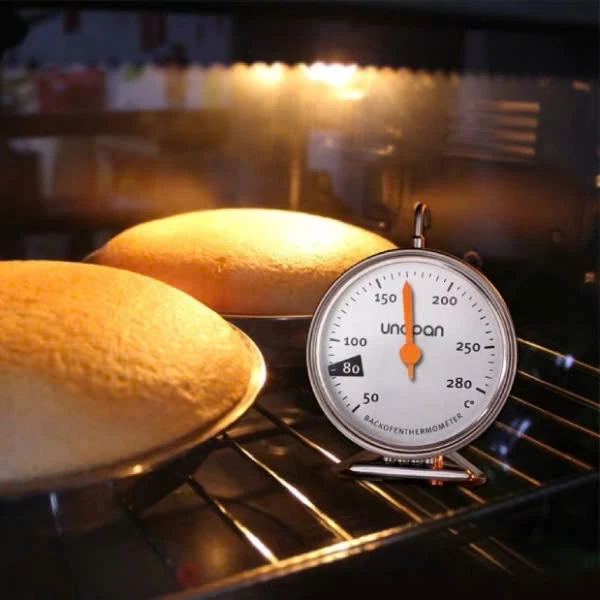 Khi nướng: Cắm đầu dò vào giữa khối bột hoặc móc nhiệt kế lên thanh giá, cài đặt nhiệt độ lò tăng dần (bắt đầu ở khoảng 150 °C), sau 5–10 phút quan sát kim chỉ thị đến độ mong muốn. Không để nhiệt độ vượt quá 280 °C để tránh làm hỏng đồng hồ.